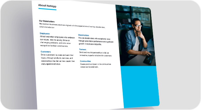 About NetApp Our Stakeholders We maintain business practices aligned with the expectations of our key stakeholders, which include our: Employees Shareholders Attract and retain employees who embrace Provide shareholders with exceptional value our values, lead inclusively, thrive on through predictable performance and significant challenging problems, and who value growth in revenues and profits. recognition for their contributions. Partners Customers Build and nourish partnerships to deliver Drive customers’ success and earn their innovative, superior solutions for customers. loyalty through products, services, and relationships that deliver new capabilities Communities and unparalleled value. Create positive impact in the communities where we live and work.