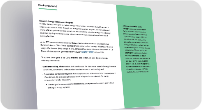Environmental NetApp’s Energy Management Program A Greener Innovation Center In 2015, NetApp set a goal to reduce energy consumption company-wide by 20 percent, a NetApp is building a state-of-the art target we achieved in 2020. Through our energy management program, we improved overall facility at Wichita State University’s energy efficiency at our facilities globally via a mix of efforts, including energy efficient design, (WSU) Innovation Campus in Kansas. advanced lighting technologies, and retro-commissioning to improve the performance of Expected to open in early 2022, the existing facilities. 168,000-square-foot facility will be powered almost entirely by renewable At our RTP campus in North Carolina, NetApp has two data centers we refer to as Global energy and deploys a suite of cutting- Dynamic Labs, or GDLs. These facilities rank as global leaders in energy efficiency, with power edge technologies to minimize resource usage effectiveness (PUE) ratings of 1.15, compared to a global data center benchmark of 1.8. consumption. Efficient lighting and ® rating of 100. These efficiencies have garnered in both GDLs an ENERGY STAR smart controls complement a high- efficiency data center. To reduce To achieve these gains at our GDLs and other data centers, we have deployed energy water use, landscape features capture efficiency innovations: and reuse rainfall. Inside the LEED- certified site, an open office plan will – Ambient cooling, where outside air is used to cool the data center instead of energy-intensive accommodate some 600 staff, ideally air chillers, condensers, and related air handlers (known as paid cooling); and situated to collaborate with WSU – A cold-aisle containment system that uses pressurized airflow to optimize the management students, faculty, and researchers. of waste heat. By eliminating the need for air to bypass tech equipment, fan energy consumption falls by 80 percent. • The design also eases equipment rebalancing since personnel can move gear without shifting air supply systems;