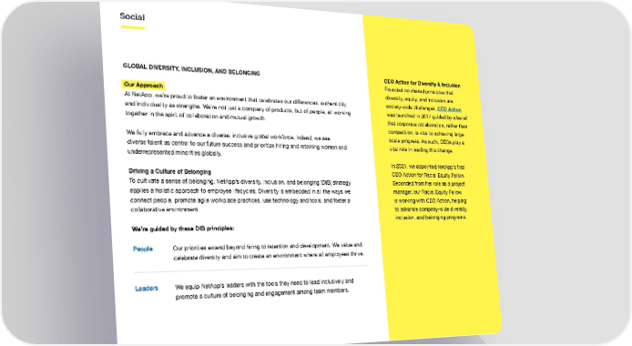 Social GLOBAL DIVERSITY, INCLUSION, AND BELONGING CEO Action for Diversity & Inclusion Founded on shared principles that Our Approach diversity, equity, and inclusion are At NetApp, we’re proud to foster an environment that celebrates our differences, authenticity, society-wide challenges, CEO Action and individuality as strengths. We’re not just a company of products, but of people, all working was launched in 2017 guided by a belief together in the spirit of collaboration and mutual growth. that corporate collaboration, rather than competition, is vital to achieving large We fully embrace and advance a diverse, inclusive global workforce. Indeed, we see scale progress. As such, CEOs play a diverse talent as central to our future success and prioritize hiring and retaining women and vital role in leading this change. underrepresented minorities globally. In 2021, we appointed NetApp’s first Driving a Culture of Belonging CEO Action for Racial Equity Fellow. To cultivate a sense of belonging, NetApp’s diversity, inclusion, and belonging (DIB) strategy Seconded from her role as a project applies a holistic approach to employee lifecycles. Diversity is embedded in all the ways we manager, our Racial Equity Fellow connect people, promote agile workplace practices, use technology and tools, and foster a is working with CEO Action, helping collaborative environment. to advance company-wide diversity, inclusion, and belonging programs. We’re guided by these DIB principles: People Our priorities extend beyond hiring to retention and development. We value and celebrate diversity and aim to create an environment where all employees thrive. Leaders We equip NetApp’s leaders with the tools they need to lead inclusively and promote a culture of belonging and engagement among team members.