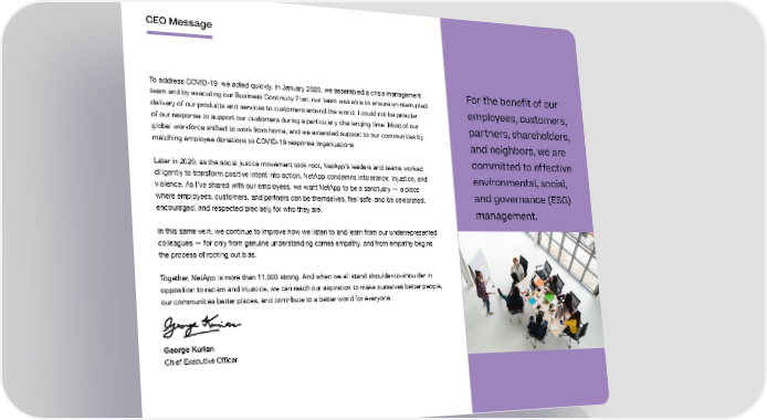 CEO Message To address COVID-19, we acted quickly. In January 2020, we assembled a crisis management For the benefit of our team and by executing our Business Continuity Plan, our team was able to ensure uninterrupted employees, customers, delivery of our products and services to customers around the world; I could not be prouder of our response to support our customers during a particularly challenging time. Most of our partners, shareholders, global workforce shifted to work from home, and we extended support to our communities by matching employee donations to COVID-19 response organizations. and neighbors, we are Later in 2020, as the social justice movement took root, NetApp’s leaders and teams worked committed to effective diligently to transform positive intent into action. NetApp condemns intolerance, injustice, and environmental, social, violence. As I’ve shared with our employees, we want NetApp to be a sanctuary — a place and governance (ESG) where employees, customers, and partners can be themselves, feel safe, and be celebrated, encouraged, and respected precisely for who they are. management. In this same vein, we continue to improve how we listen to and learn from our underrepresented colleagues — for only from genuine understanding comes empathy, and from empathy begins the process of rooting out bias. Together, NetApp is more than 11,000 strong. And when we all stand shoulder-to-shoulder in opposition to racism and injustice, we can reach our aspiration to make ourselves better people, our communities better places, and contribute to a better world for everyone. George Kurian Chief Executive Officer
