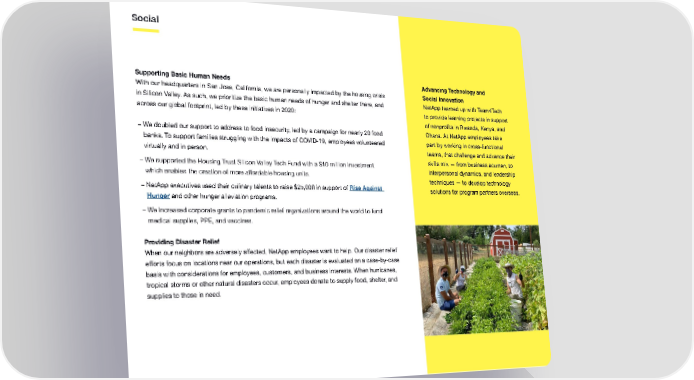 Social Supporting Basic Human Needs Advancing Technology and With our headquarters in San Jose, California, we are personally impacted by the housing crisis Social Innovation in Silicon Valley. As such, we prioritize the basic human needs of hunger and shelter there, and NetApp teamed up with Team4Tech across our global footprint, led by these initiatives in 2020: to provide learning projects in support of nonprofits in Rwanda, Kenya, and – We doubled our support to address to food insecurity, led by a campaign for nearly 20 food Ghana. At NetApp employees take banks. To support families struggling with the impacts of COVID-19, employees volunteered part by working in cross-functional virtually and in person. teams, that challenge and advance their – We supported the Housing Trust Silicon Valley Tech Fund with a $10 million investment skills mix — from business acumen, to which enables the creation of more affordable housing units. interpersonal dynamics, and leadership techniques — to develop technology – NetApp executives used their culinary talents to raise $25,000 in support of Rise Against solutions for program partners overseas. Hunger and other hunger alleviation programs. – We increased corporate grants to pandemic relief organizations around the world to fund medical supplies, PPE, and vaccines. Providing Disaster Relief When our neighbors are adversely affected, NetApp employees want to help. Our disaster relief efforts focus on locations near our operations, but each disaster is evaluated on a case-by-case basis with considerations for employees, customers, and business interests. When hurricanes, tropical storms or other natural disasters occur, employees donate to supply food, shelter, and supplies to those in need.