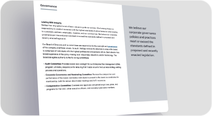 Governance Leading With Integrity We believe our NetApp has long upheld a set of basic values to guide our actions. Chief among those is a corporate governance responsibility to conduct ourselves with the highest standards of ethical behavior when relating to customers, partners, employees, investors, and our communities. We believe our corporate policies and practices governance policies and practices meet or exceed the standards defined in proposed and recently enacted legislation. meet or exceed the Our Board of Directors and its committees are responsible for the oversight and governance standards defined in of the company and these values. As such, NetApp reviews the directors to ensure the board proposed and recently is comprised of individuals with the highest professional and personal ethics. Each director has enacted legislation. broad experience at the policy-making level in business, education, and/or technology. The board delegates authority to the following committees: – Audit Committee: Provides board-level oversight for our Enterprise Risk Management (ERM) program; ultimately responsible for ensuring that it adds value to the business strategy-setting process and operations. – Corporate Governance and Nominating Committee: Reviews the composition and performance of the board; nominates individuals to present to the board as candidates for membership, both for annual stockholder meetings and to fill vacancies. – Compensation Committee: Oversees and approves compensation policies, plans, and programs for the CEO, other executive officers, and non-employee board members. 37
