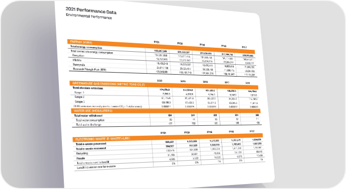 2021 Performance Data Environmental Performance FY21 FY20 FY19 FY18 FY17 ENERGY (KWH) Total energy consumption 193,647,549 201,562,327 211,650,090 217,194,798 228,223,885 Total owned site energy consumption 167,051,858 173,611,475 187,959,768 191,117,687 198,377,011 Bangalore 16,757,820 17,417,042 25,679,239 22,085,211 8,930,177 Wichita 18,430,019 19,003,037 18,450,415 19,603,819 21,995,752 Sunnyvale 25,917,138 29,025,677 36,338,788 41,266,715 50,297,030 Research Triangle Park (RTP) 105,946,881 108,165,719 107,491,326 108,161,942 117,154,052 2020 2019 2018 2017 2016 GREENHOUSE GAS EMISSIONS (METRIC TONS CO E) 2 Total absolute emissions 124,285.0 157,924.8 167,500.0 166,208.0 164,736.0 Scope 1 2,358.9 4,676.5 5,354.0 5,748.0 7,613.0 Scope 2 61,145.8 91,524.9 96,532.0 97,065.0 115,182.0 Scope 3 60,780.3 61,723.3 65,614.0 63,395.0 41,941.0 GHG emissions intensity (metric tonnes CO2e / total revenue) 0.000011 0.000018 0.000016 0.000017 0.000023 WATER USE (MEGALITERS) Total water withdrawal 194 244 256 254 220 Total water consumption 30 44 66 87 111 Total water discharge 177 200 190 166 109 FY21 FY20 FY19 FY18 FY17 ELECTRONIC WASTE (E-WASTE) (LBS) Total e-waste processed 969,522 1,003,069 1,573,026 1,767,571 1,854,639 Total e-waste recovered 964,927 997,539 1,558,998 1,762,492 1,837,203 Recycling 732,516 964,608 1,480,339 1,611,358 1,767,661 Resale 51,765 32,931 78,659 151,134 69,542 Total e-waste sent to landfill 4,595 5,530 14,028 5,079 17,436 Landfill diversion rate for e-waste 0% 0% 1% 0% 1%