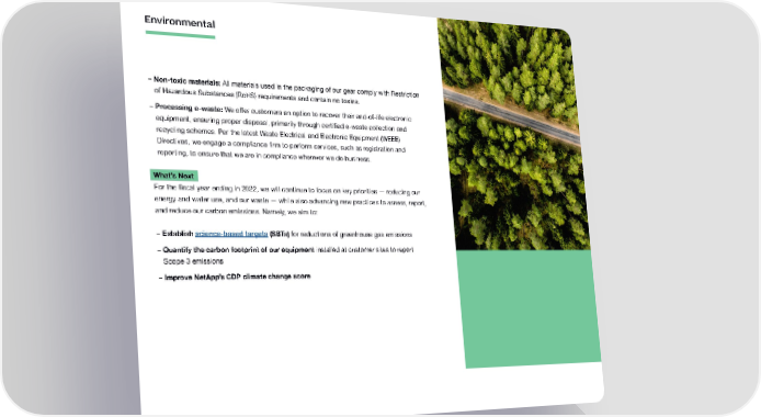 Environmental – Non-toxic materials: All materials used in the packaging of our gear comply with Restriction of Hazardous Substances (RoHS) requirements and contain no toxins. – Processing e-waste: We offer customers an option to recover their end-of-life electronic equipment, ensuring proper disposal, primarily through certified e-waste collection and recycling schemes. Per the latest Waste Electrical and Electronic Equipment (WEEE) Directives, we engage a compliance firm to perform services, such as registration and reporting, to ensure that we are in compliance wherever we do business. What’s Next For the fiscal year ending in 2022, we will continue to focus on key priorities — reducing our energy and water use, and our waste — while also advancing new practices to assess, report, and reduce our carbon emissions. Namely, we aim to: – Establish science-based targets (SBTs) for reductions of greenhouse gas emissions – Quantify the carbon footprint of our equipment installed at customer sites to report Scope 3 emissions – Improve NetApp’s CDP climate change score 33