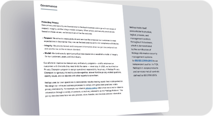Governance Protecting Privacy NetApp holds itself Data privacy and security are foundational to NetApp’s business and align with our values of accountable to physical, respect, integrity, and building a model company. When privacy and security practices are logical, process, and based on these values, we believe trust will be the outcome: management controls – Respect: We strive to create products and services that empower our customers to meet throughout its business, expectations in the manner they view as the best practice and in full compliance with the law. which is demonstrated – Integrity: We provide honest and transparent information about our policies and practices by the certification of and use the law as the minimum standard. NetApp information security – Model: We continuously optimize our business operations to establish a model of integrity management systems for our customers, peers, and the industry. to ISO/IEC 27001:2013 by an Our efforts to improve our data privacy and security programs — and to empower our independent auditor. In FY21, customers with the tools they need to do the same — never stop. In 2020, we launched our NetApp’s in-scope products Privacy Champion program to assign operational responsibility for privacy. A NetApp Privacy Champion is rigorously trained to provide expertise, answer frontline privacy-related questions, and services met all controls identify issues, and collaborate with other experts to solve them. defined by ISO 27001:2013. NetApp uses our own operations to demonstrate industry-leading capabilities in data protection. We design our in-house business processes to comply with global best practices in data privacy and security. For example, our internal privacy policy details how we collect or observe information through a variety of contexts, collectively referred to as the “NetApp Platform.” The policy also discloses how we use, process, store, transfer, and disclose personal information. 40