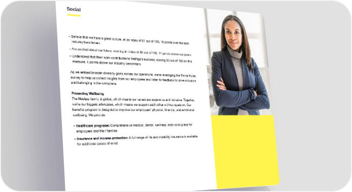 Social – Believe that we have a great culture, at an index of 81 out of 100, 10 points over the tech industry benchmark. – Are excited about our future, scoring an index of 85 out of 100, 11 points above our peers. – Understand that their work contributes to NetApp’s success, scoring 85 out of 100 on this measure, 4 points above our industry benchmark. As we embed broader diversity goals across our operations, we’re leveraging the Thrive Pulse survey to help us collect insights from our employees and listen to feedback to drive inclusion and belonging in the workplace. Protecting Wellbeing The NetApp family is global, which means our values are expansive and inclusive. Together, we’re our biggest advocates, which means we support each other without question. Our benefits program is designed to improve our employees’ physical, financial, and emotional wellbeing. We provide: – Healthcare programs: Comprehensive medical, dental, wellness, and vision plans for employees and their families – Insurance and income protection: A full range of life and disability insurance is available for additional peace of mind