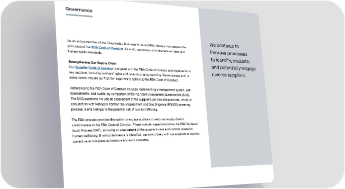 Governance We continue to As an active member of the Responsible Business Alliance (RBA), NetApp has adopted the improve processes principles of the RBA Code of Conduct. As such, we comply with international labor and human rights standards. to identify, evaluate, Strengthening Our Supply Chain and potentially engage Our Supplier Code of Conduct is aligned with the RBA Code of Conduct and implements its diverse suppliers. key sections, including workers’ rights and noncompliance reporting. We encourage and, in some cases, require our first-tier suppliers to adhere to the RBA Code of Conduct. Adherence to the RBA Code of Conduct includes implementing a management system, self- assessments, and audits, by completion of the RBA Self-Assessment Questionnaire (SAQ). The SAQ questions include an assessment of the supplier’s policies and practices, which, in conjunction with NetApp’s Partner Risk Assessment and Due Diligence (PRADD) screening process, alerts NetApp to the potential risk of human trafficking. The RBA process provides the option to engage auditors to verify our supply chain’s conformance to the RBA Code of Conduct. These outside inspections follow the RBA Validated Audit Process (VAP), including an assessment of the supplier’s risks and controls related to human trafficking. If nonconformance is identified, we work closely with our suppliers to develop corrective action plans and resolve any audit concerns. 43