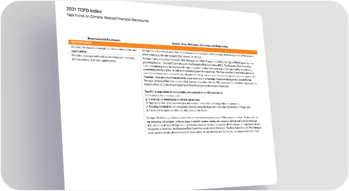 2021 TCFD Index Task Force on Climate-Related Financial Disclosures Recommended Disclosures Answer, Cross-Reference, Omissions, and Explanations GOVERNANCE Describe the board’s oversight of climate-related risks and NetApp has a board-level Audit Committee that provides oversight to the Enterprise Risk Management (ERM) program, opportunities. which includes a risk sub-category that focuses on climate. Describe management’s role in assessing and managing NetApp maintains a robust Enterprise Risk Management (ERM) Program and Policy. NetApp's ERM Program has two climate-related risks and opportunities. governing bodies – the Audit Committee and the Executive Risk Committee (ERC). The Executive Risk Committee is the coordinating body that oversees NetApp's response to risks that could impact NetApp's ability to achieve its overarching strategic goals, as well as its underlying business objectives. The Executive Risk Committee consists of selected members from each of the five risk pillars (strategic, operational, financial, compliance, human capital — Vice President / Executive Vice President level, cross-functional membership), Executive Management, and ERM Risk Manager. Individual Risk Owners share their function's top risks with the ERC every quarter. If the risk is significant, the board is informed at the Annual Audit Committee Meeting or even sooner, if necessary. The ERC is responsible for accountability and oversight of our ERM process in: (1) Identifying climate-related risks; (2) Ownership for identification of climate-related risks; (3) Approval of risk mitigation strategies and resource allocations to manage risks as appropriate; (4) Ensuring stakeholders are adequately informed about the long-term, risk-adjusted business strategy; and (5) Escalation of significant risks and risk events to the board. NetApp's Risk Manager holds a central role in coordinating ongoing global ERM program activities. The life cycle of our enterprise risk program includes steps to identify, assess, decide, act, respond, recover, and monitor individual risks related to climate. NetApp has a governance structure in place to address climate change. If a significant climate- related risk is identified, the Executive Risk Committee would inform the board. The Risk Committee and Risk Manager would provide detailed information to the board about the risk/incident and the timeline for response and next steps.
