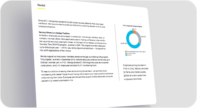 Social Since 2017, NetApp has donated $105,000 toward recovery efforts for fires, hurricanes, FY21 Corporate Giving by Region and floods. We have provided an additional $505,676 by matching disaster relief-focused $95,517 employee donations. Serving Others is a NetApp Tradition $432,022 At NetApp, employees are encouraged to donate their time through individual, team, or company volunteer efforts. We support employees in making a difference in the world in the ways that are most meaningful to them. At the heart of how NetApp contributes is our $1,027,982 Volunteer Time Off (VTO) program, launched in 2007. This program provides employees up to 40 hours per year — with full pay, during regular business hours — to support the non-profit organizations of their choice. Europe, the ie East, a Arica (EEA) Asia-Pacific (APAC) Aericas We also support our employees’ charitable donations through our Matching Gifts program. This program, launched in September 2019, matches employee donations one-for-one up to $500 per calendar year. In FY21, NetApp donated $1.7M through employee and corporate contributions, and 2,141 employees recorded 26,477 volunteering hours. Employee giving doubled in FY21. In total, NetApp donated To keep our tradition of serving others active during the pandemic, we launched virtual $1.7M to charitable causes, volunteering and created “impact hours” during which teams could make a positive contribution while working from home. Employees also showed their support for first responders during the $875K of which came from pandemic by preparing emergency kits. employee donations.