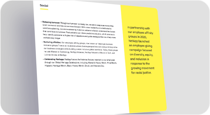 Social – Reducing turnover: Though our turnover is already low, we aim to keep even more of the In partnership with talent we recruit and hire as we move forward. With a new leadership role dedicated to our employee affinity workforce planning, we are re-assessing historical patterns to better understand the factors that contribute to turnover. Past patterns can inform predictive analytics, which promise to groups in 2020, help identify personnel at higher risk of departure and guide strategies that could help more workers stay longer. NetApp launched – Nurturing affinities: Our employee affinity groups, now known as “employee business an employee giving resource groups,” serve as incubators where diverse perspectives can catalyze to help refine campaign focused our business strategies while building a more inclusive global workforce. Today, these groups include Women in Technology, NetApp Veterans, NetApp Network of Blacks in Tech, and on diversity, equity, Latinos Unidos at NetApp. – Celebrating Heritage: NetApp honors the histories that are important to our employees and inclusion in through our Global Heritage Celebrations, including Women’s History Month, Pride Month, response to the Hispanic Heritage Month, Black History Month, Diwali, and Veterans Day. growing movement for racial justice.