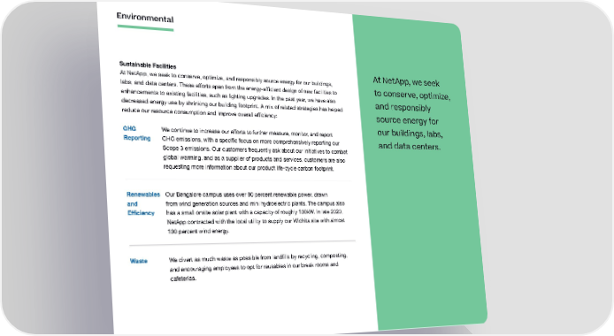 Environmental Sustainable Facilities At NetApp, we seek At NetApp, we seek to conserve, optimize, and responsibly source energy for our buildings, to conserve, optimize, labs, and data centers. These efforts span from the energy-efficient design of new facilities to enhancements to existing facilities, such as lighting upgrades. In the past year, we have also and responsibly decreased energy use by shrinking our building footprint. A mix of related strategies has helped reduce our resource consumption and improve overall efficiency: source energy for GHG We continue to increase our efforts to further measure, monitor, and report our buildings, labs, Reporting GHG emissions, with a specific focus on more comprehensively reporting our and data centers. Scope 3 emissions. Our customers frequently ask about our initiatives to combat global warming, and as a supplier of products and services, customers are also requesting more information about our product life-cycle carbon footprint. Renewables Our Bangalore campus uses over 80 percent renewable power, drawn and from wind generation sources and mini hydroelectric plants. The campus also Efficiency has a small onsite solar plant with a capacity of roughly 100kW. In late 2020, NetApp contracted with the local utility to supply our Wichita site with almost 100 percent wind energy. Waste We divert as much waste as possible from landfills by recycling, composting, and encouraging employees to opt for reusables in our break rooms and cafeterias.