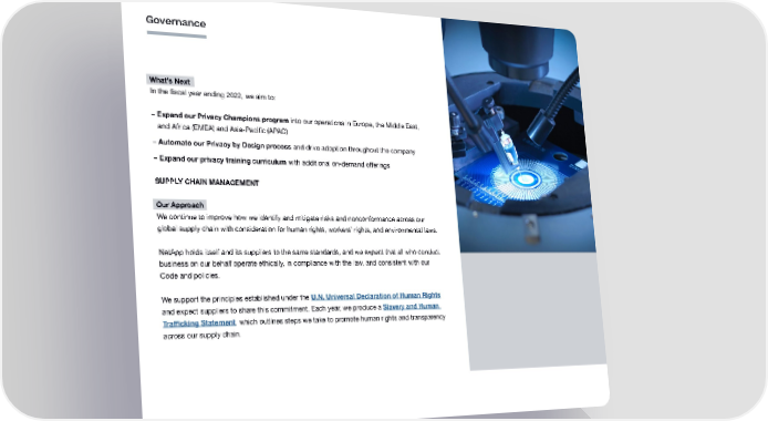 Governance What’s Next In the fiscal year ending 2022, we aim to: – Expand our Privacy Champions program into our operations in Europe, the Middle East, and Africa (EMEA) and Asia-Pacific (APAC) – Automate our Privacy by Design process and drive adoption throughout the company – Expand our privacy training curriculum with additional on-demand offerings SUPPLY CHAIN MANAGEMENT Our Approach We continue to improve how we identify and mitigate risks and nonconformance across our global supply chain with consideration for human rights, workers’ rights, and environmental laws. NetApp holds itself and its suppliers to the same standards, and we expect that all who conduct business on our behalf operate ethically, in compliance with the law, and consistent with our Code and policies. We support the principles established under the U.N. Universal Declaration of Human Rights and expect suppliers to share this commitment. Each year, we produce a Slavery and Human Trafficking Statement, which outlines steps we take to promote human rights and transparency across our supply chain. 42 NETAPP 2021 ESG REPORT