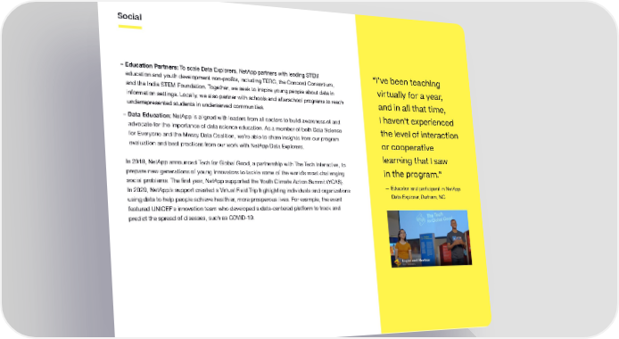 Social – Education Partners: To scale Data Explorers, NetApp partners with leading STEM “ I’ve been teaching education and youth development non-profits, including TERC, the Concord Consortium, virtually for a year, and the India STEM Foundation. Together, we seek to inspire young people about data in information settings. Locally, we also partner with schools and afterschool programs to reach and in all that time, underrepresented students in underserved communities. – Data Education: NetApp is aligned with leaders from all sectors to build awareness of and I haven’t experienced advocate for the importance of data science education. As a member of both Data Science the level of interaction for Everyone and the Messy Data Coalition, we’re able to share insights from our program or cooperative evaluation and best practices from our work with NetApp Data Explorers. In 2019, NetApp announced Tech for Global Good, a partnership with The Tech Interactive, to learning that I saw prepare new generations of young innovators to tackle some of the world’s most challenging in the program.” social problems. The first year, NetApp supported the Youth Climate Action Summit (YCAS). In 2020, NetApp’s support created a Virtual Field Trip highlighting individuals and organizations — Educator and participant in NetApp using data to help people achieve healthier, more prosperous lives. For example, the event Data Explorer, Durham, NC featured UNICEF’s innovation team who developed a data-centered platform to track and predict the spread of diseases, such as COVID-19.